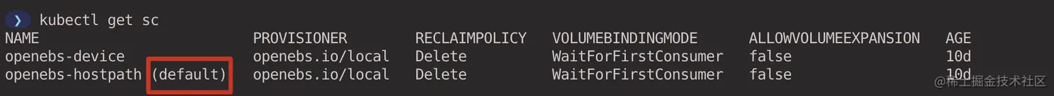 设置 StorageClass openebs-hostpath 作为默认的 StorageClass。
