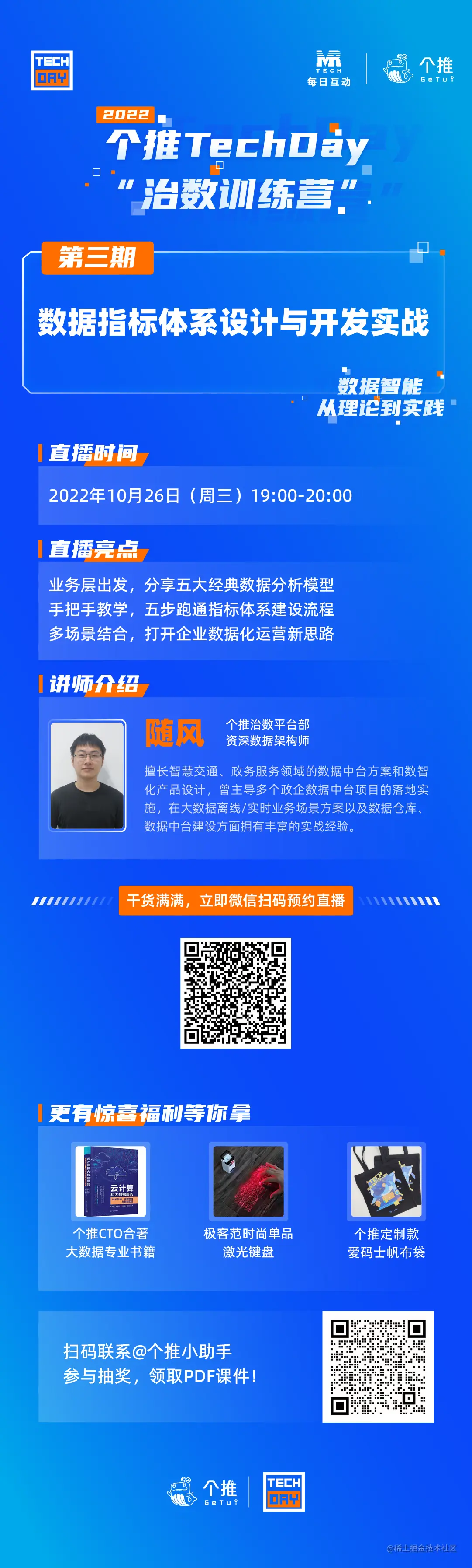 10月26日(下周三)19:00-20:00,来自个推治数平台部的数据架构师将为您深入浅出分享数据指标体系设计的思路和方法,手把手教学,带大家跑通数据指标体系建设全流程、轻松掌握数据化运营策略。产品、运营、数据开发、数据分析师,都值得一看!