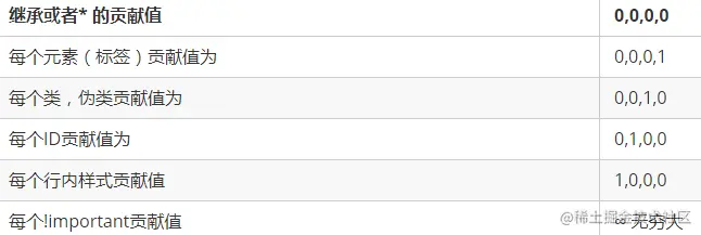 关于CSS权重,我们需要一套计算公式来去计算,这个就是 CSS Specificity,我们称为CSS 特性或称非凡性,它是一个衡量CSS值优先级的一个标准 具体规范入如下: