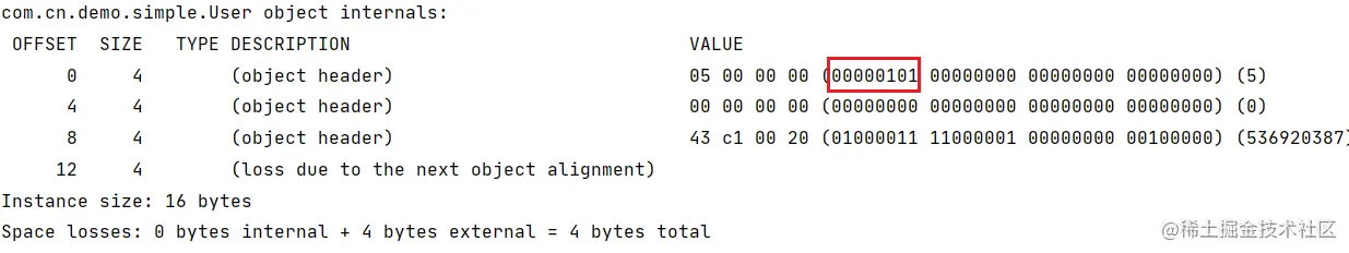 001**无锁态,并且处于不可偏向状态。如果之后有线程再尝试获取 user 对象的锁,会直接加轻量级锁,而不是偏向锁