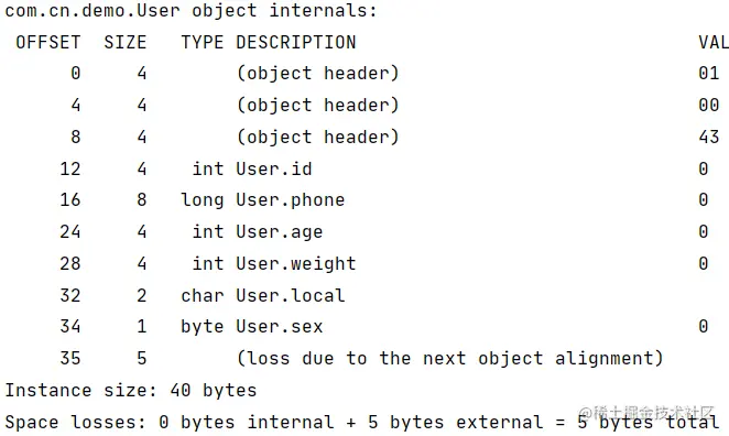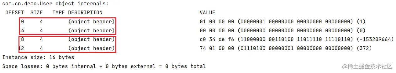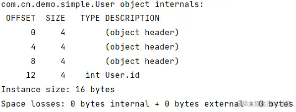 System.out.println(ClassLayout.parseInstance(user).toPrintable());