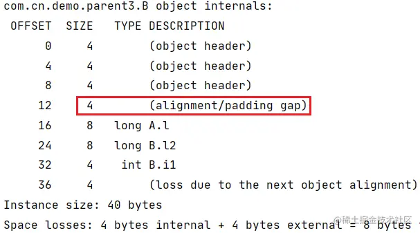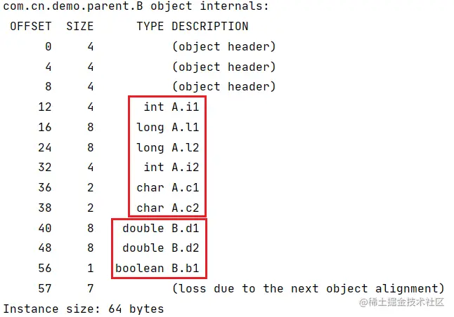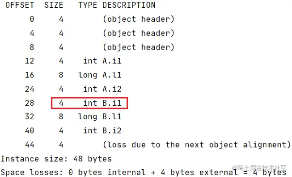 因此在上面的内存布局中,先使用 4 字节的int进行前置补位,再按第一条规则从大到小顺序进行排列。如果我们删除 3 个int类型的字段,再查看内存布局: