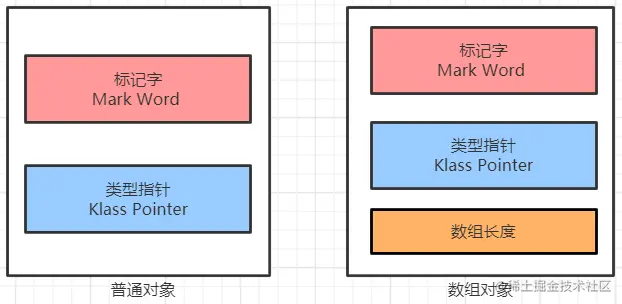 首先看一下对象头(Object header)的组成部分,根据普通对象和数组对象的不同,结构将会有所不同。只有当对象是数组对象才会有数组长度部分,普通对象没有该部分,如下图所示: