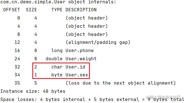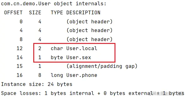 char和byte类型的变量被提到前面进行前置补位,并在long类型前进行了 1 字节的对齐填充。