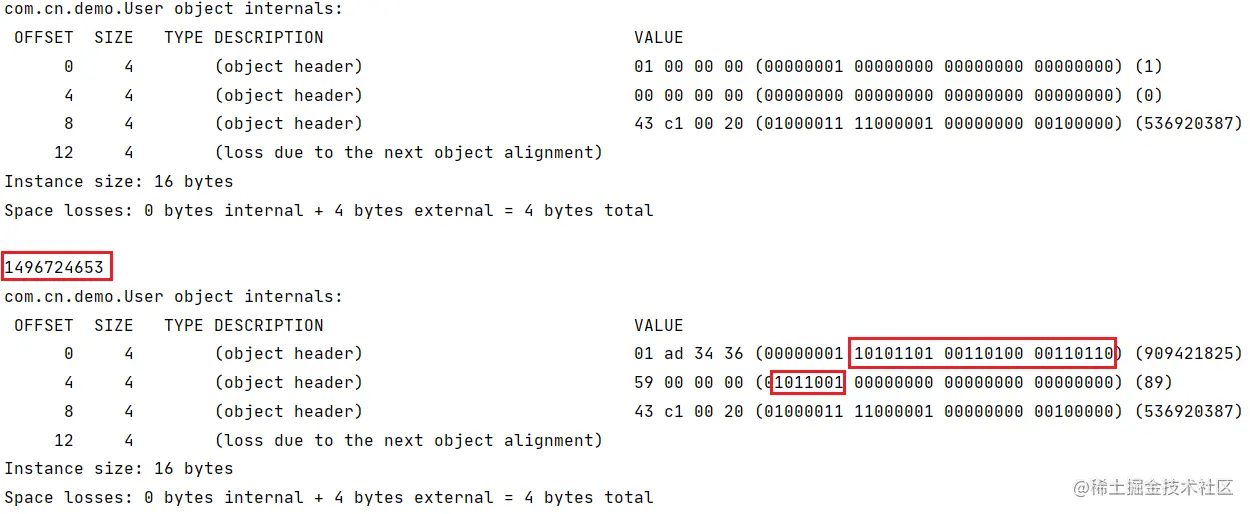将 2 进制转换为 10 进制,对应哈希值1496724653。需要注意,只有在调用没有被重写的Object.hashCode()方法或System.identityHashCode(Object)方法才会写入mark word,执行用户自定义的hashCode()方法不会被写入。