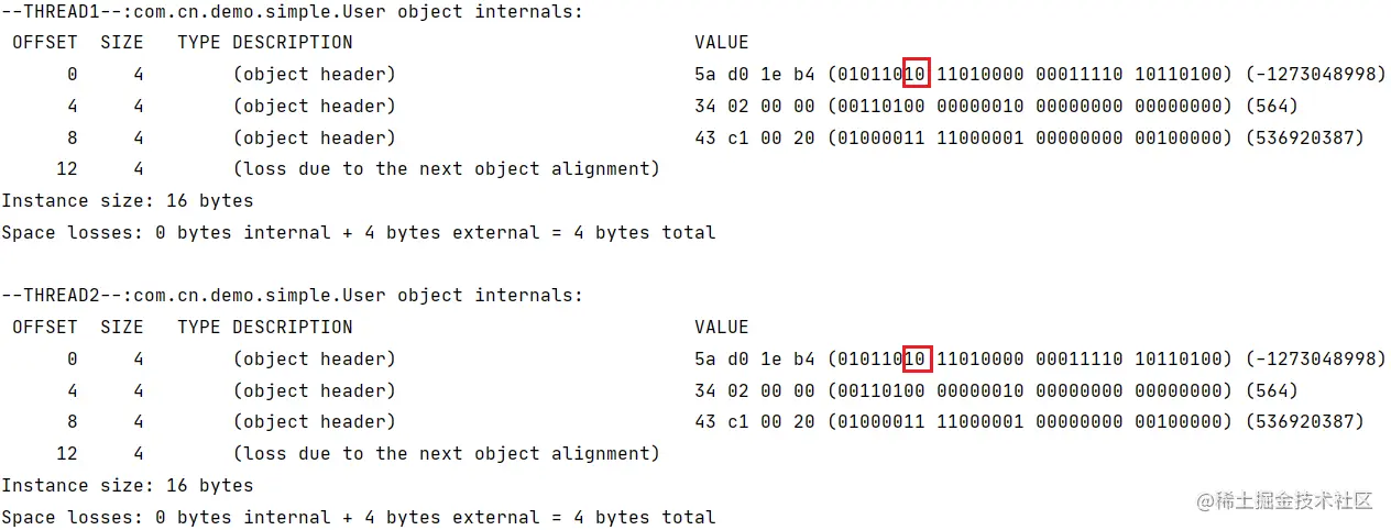 System.out.println("--THREAD2--:" + ClassLayout.parseInstance(user).toPrintable());