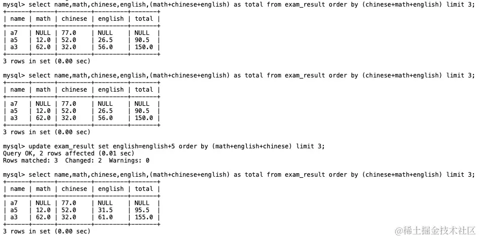 update exam_result set english=english+5 order by (math+english+chinese) limit 3;