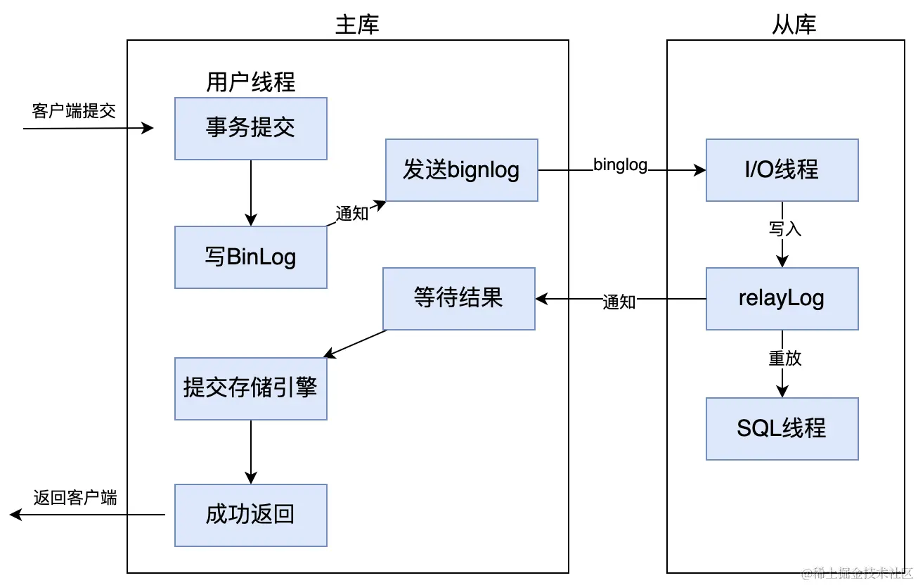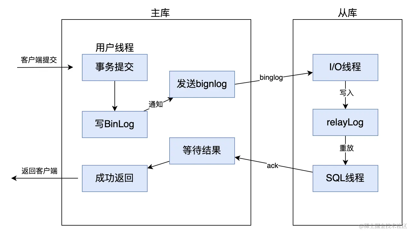 而异步复制,就是当主库提交事物后,会通知 binlog dump 线程发送 binlog 日志给从库,一旦 binlog dump 线程将 binlog 日志发送给从库之后,不需要等到从库也同步完成事务,主库就会将处理结果返回给客户端。