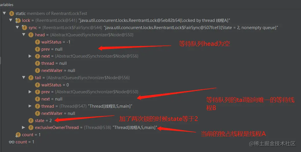 在代码中,我们进行了两次lock,这就是可重入锁。我们通过断点调试,来分析第二次加锁后lock中的值,下面给出了说明。