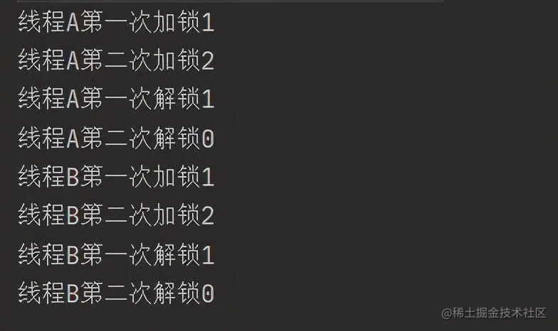 在介绍AQS时,我们讲到了AQS中有个状态值state,这个值用来判断当前资源的可用状态。可重入锁的意思就是对一个对象可以实现多次加锁,state就用来记录加锁的次数。下面写一段代码: