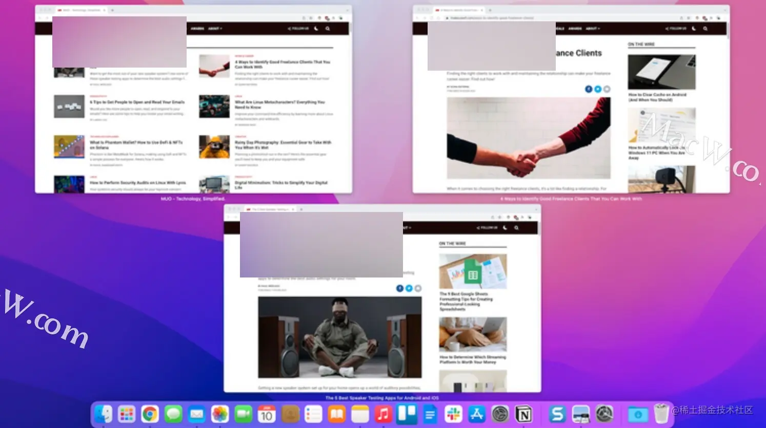 您也可以使用触摸板或鼠标滚轮与 Dock 项目进行交互。启用后,此命令允许您使用向上滚动手势打开dock,或在已运行的应用程序上使用相同的手势以显示与该应用程序关联的所有窗口(也称为 Exposé,如图所示)。