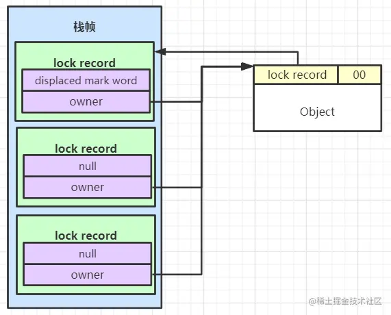lock record中的displaced mark word为null,只存储了指向对象的owner指针