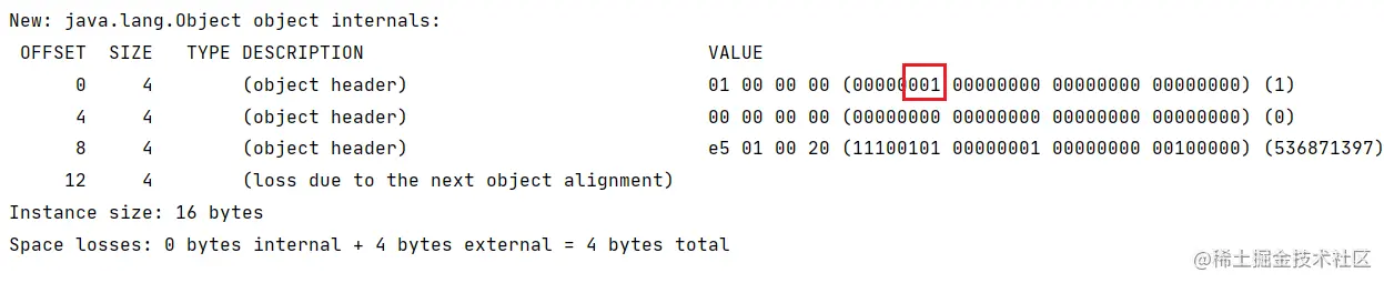 可以看到,即使经过一定的启动延时,对象一直处于001无锁不可偏向状态。大家可能会有疑问,在无锁状态下,为什么要存在一个不可偏向状态呢?通过查阅资料得到的解释是: