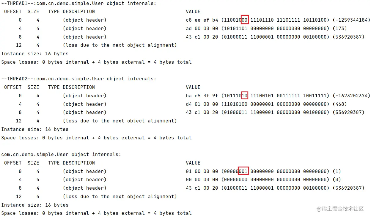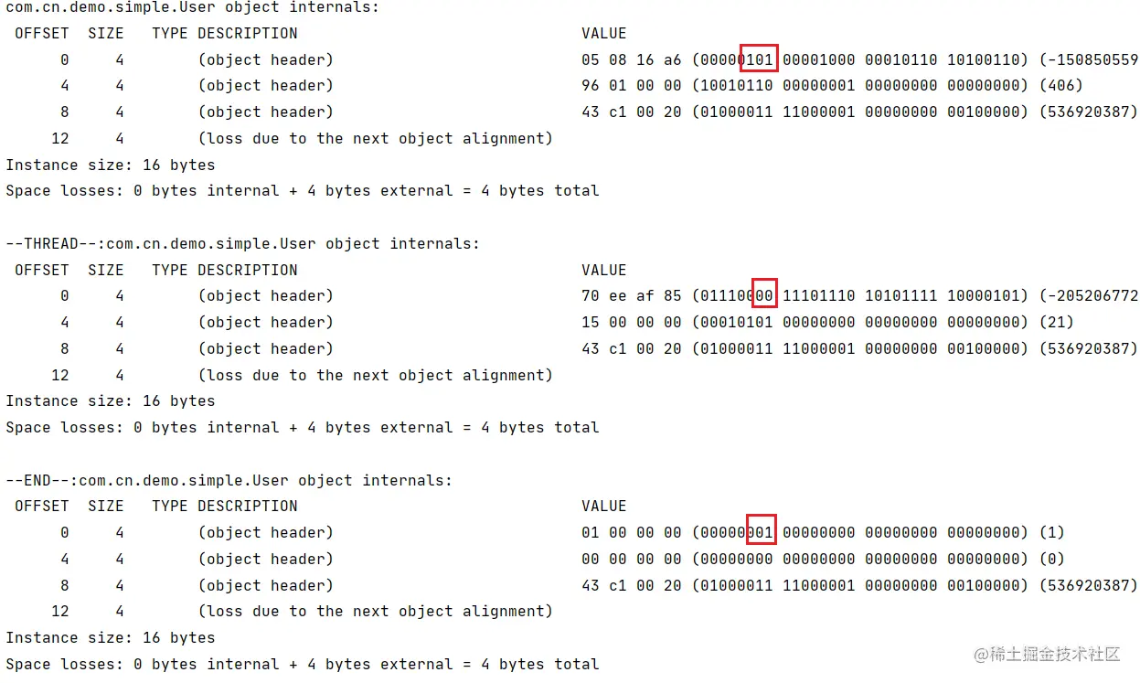 System.out.println("--THREAD END--:" + ClassLayout.parseInstance(user).toPrintable());