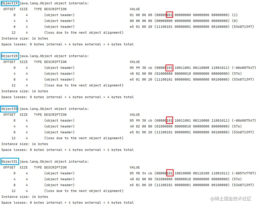 线程t2在访问前 19 个对象时对象的偏向锁会升级到轻量级锁,在访问后 11 个对象(下标 19-29)时,因为偏向锁撤销次数达到了 20,会触发批量重偏向,将锁的状态变为偏向线程t2。在全部线程结束后,再次查看第 19、20、30、31 个对象锁的状态: