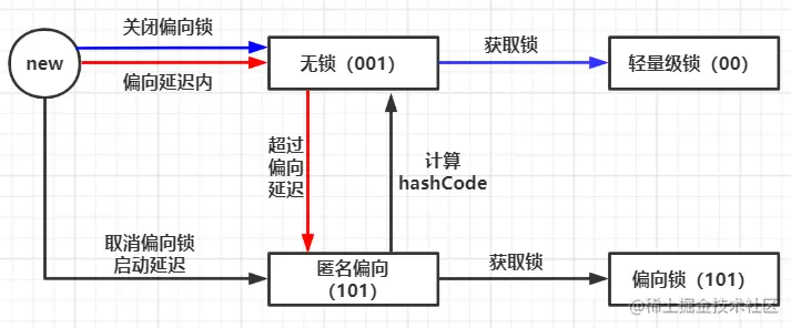 准确来说,无锁可偏向状态应该叫做匿名偏向(Anonymously biased)状态,因为这时对象的mark word中后三位已经是101,但是threadId指针部分仍然全部为 0,它还没有向任何线程偏向。综上所述,对象在刚被创建时,根据 jvm 的配置对象可能会处于 无锁 或 匿名偏向 两个状态。