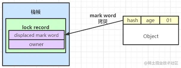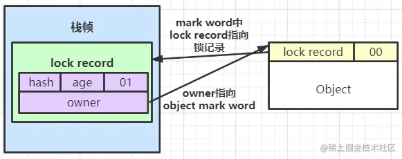 lock record,displaced mark word复制了锁对象的mark word,owner指针指向锁对象 -