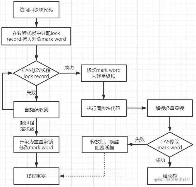 在上面分析的基础上,再加上我们上一篇中讲到的轻量级锁升级到重量级锁的知识,就可以对上面的流程图进行完善了:
