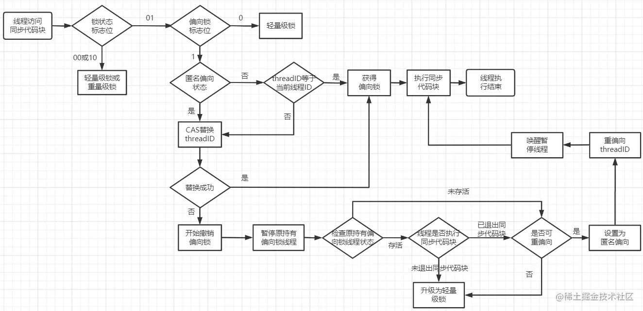 如果之后有线程再次尝试获取锁时,需要检查mark word中存储的threadID是否与自己相同即可,如果相同那么表示当前线程已经获得了对象的锁,不需要再使用 CAS 操作来进行加锁。