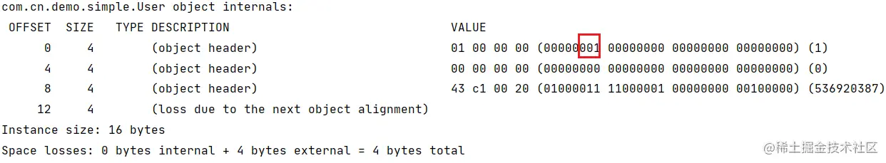 System.out.println(ClassLayout.parseInstance(user).toPrintable());