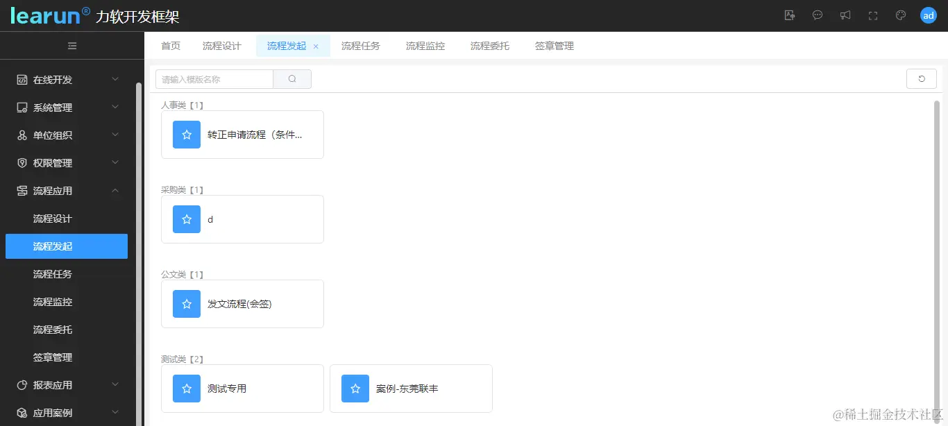 在左侧的流程任务状态选择发起任务,旁边会显示所有的流程任务分类,要发起哪一类流程,右侧看板就会显示该分类下所有有效的流程模板,点击一个模板就可以进入到对应的流程发起表单填写页面。