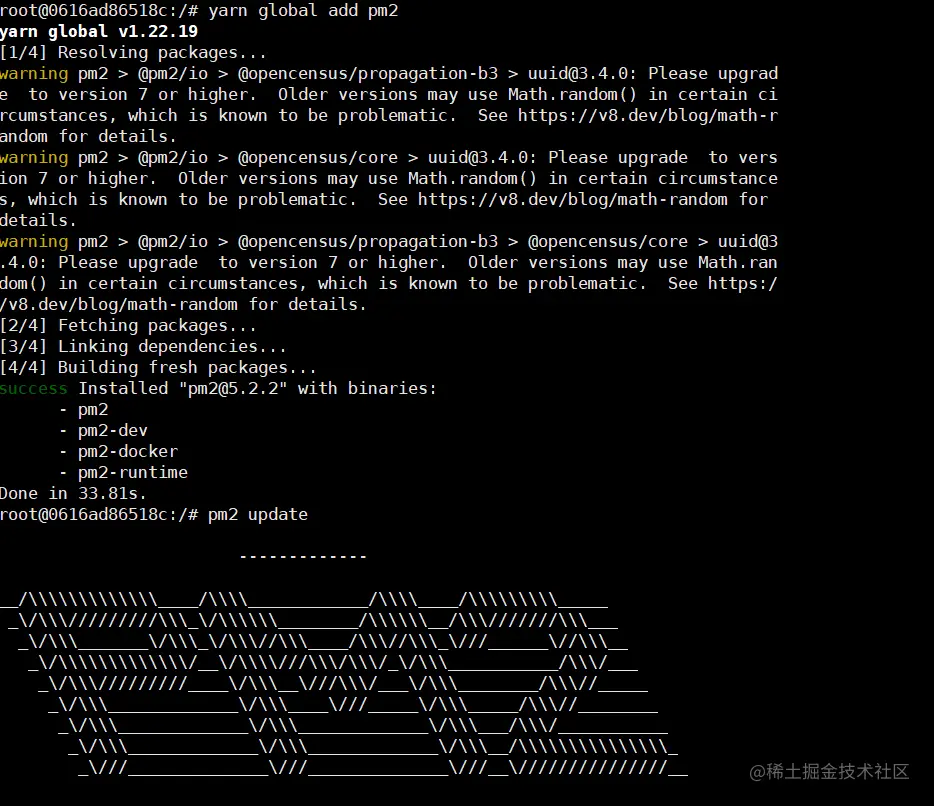 pm2 的安装需要 node.js 的环境,npm 是 node.js 内置应用,直接在容器中下载