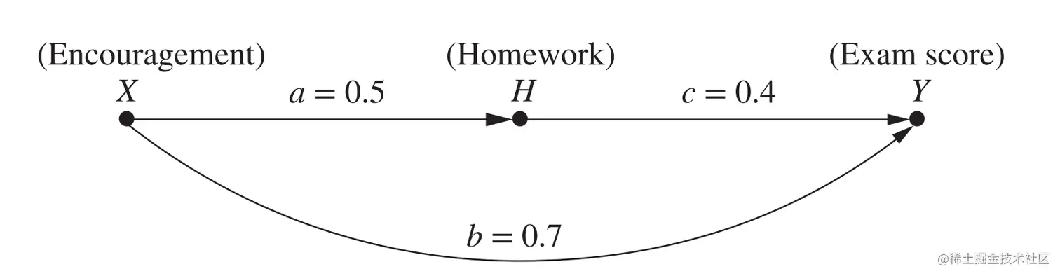下面用图 1 来现实反事实在个体行为推理中的作用 : X 代表学生花在课后补习班的时间,H 代表学生做的家庭作业的数量,Y 代表学生的考试成绩。每个变量的值都以学生的均值以上的标准差数给出 (也就是说,模型是标准化的,因此所有变量的均值为0,方差为1)。这个模型代表了一个随机的试点项目,在这个项目中,学生随机地指定参加课后补习。
