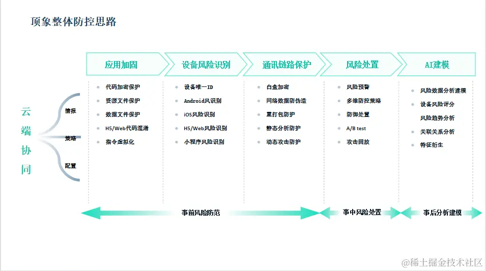 首先,顶象利用云端协同机制将云上的能力与端上的能力做联动优化。云上的能力包括业务安全情报、防控策略沉淀、配置建议等。同时涵盖事前风险防范——事中风险处置——事后分析建模的风险应对体系。