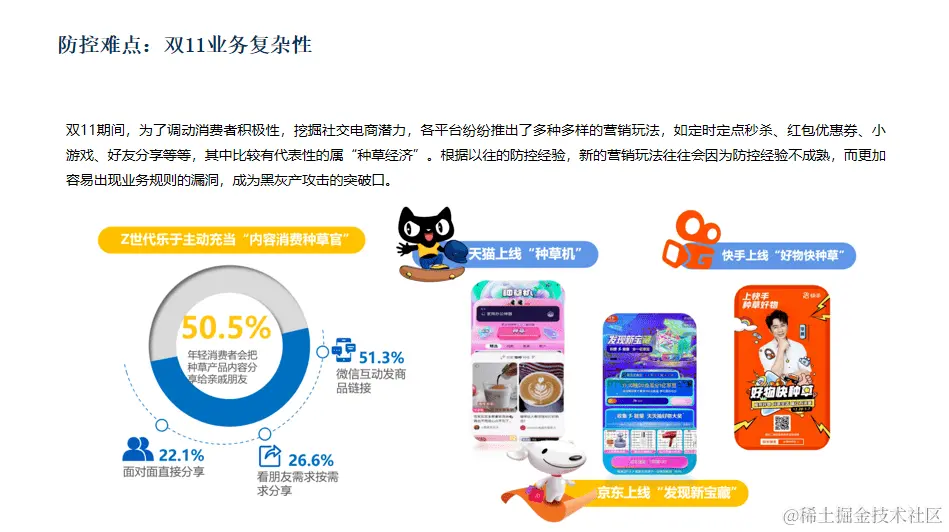 双11期间,为了调动消费者积极性,挖掘社交电商潜力,各平台纷纷推出了多种多样的营销玩法,如定时定点秒杀、红包优惠券、小游戏、好友分享等等,其中比较有代表性的属“种草经济”。根据以往的防控经验,新的营销玩法往往会因为防控经验不成熟,而更加容易出现业务规则的漏洞,成为黑灰产攻击的突破口。