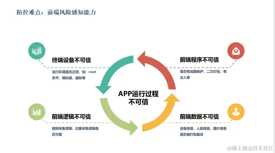 前端包括终端设备、前端程序、前端逻辑、前端数据等都是不可信的,因为黑灰产在任何一个环节都可能发起攻击,我们无法判断用户的好坏之分。比如在终端设备上,黑灰产可以通过Root、多开软件、模拟器、越狱软件等发起攻击。
