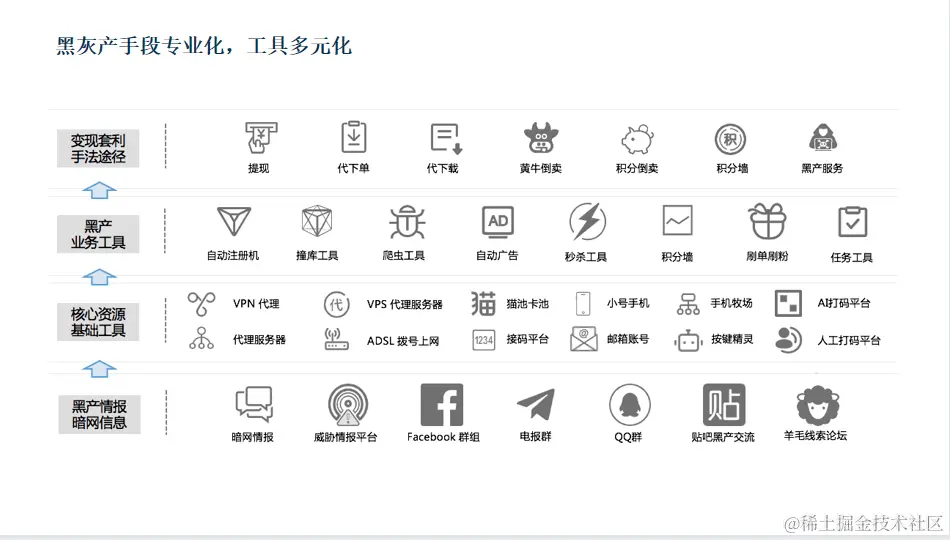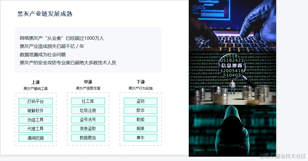 且黑灰产“从业者”已经超过1000万人,黑灰产业造成损失已超千亿/年,数据泄漏成为社会问题,黑灰产的安全攻防专业度已超绝大多数技术人员,也使得防控难度进一步提升。