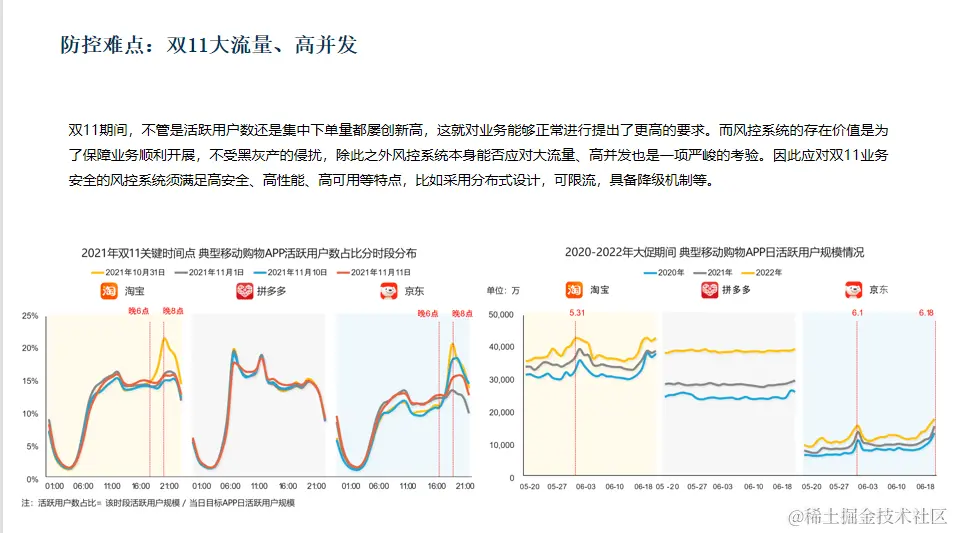 双11期间,不管是活跃用户数还是集中下单量都屡创新高,这就对业务能够正常进行提出了更高的要求。而风控系统的存在价值是为了保障业务顺利开展,不受黑灰产的侵扰,除此之外风控系统本身能否应对大流量、高并发也是一项严峻的考验。因此应对双11业务安全的风控系统须满足高安全、高性能、高可用等特点,比如采用分布式设计,可限流,具备降级机制等。