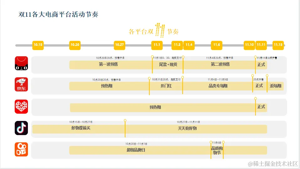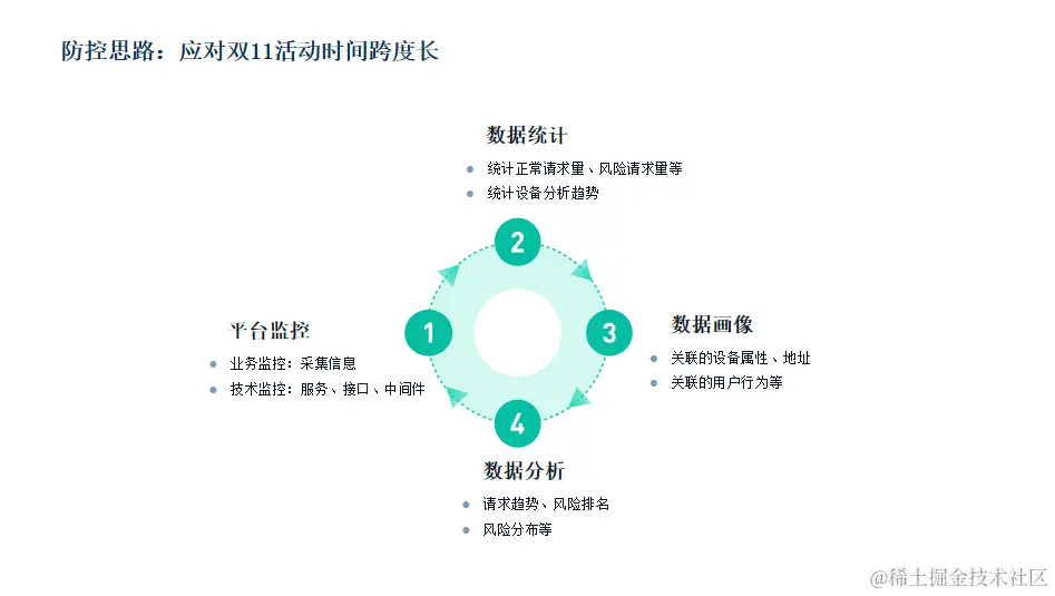 针对双十一活动时间跨度长的问题,这就需要有完善的监控机制来对业务和技术进行监控、强有力的数据统计能力以及清晰的数据画像、风险画像等。