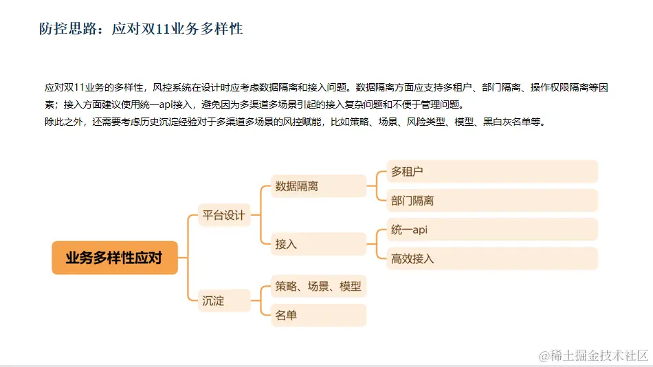 针对双十一业务多样性,风控系统在设计时应考虑数据的隔离和接入问题,数据隔离方面应支持多租户、部门隔离、操作权限隔离等因素;接入方面建议使用统一API接入,避免因为多渠道多场景引起的接入复杂问题和不便于管理问题。