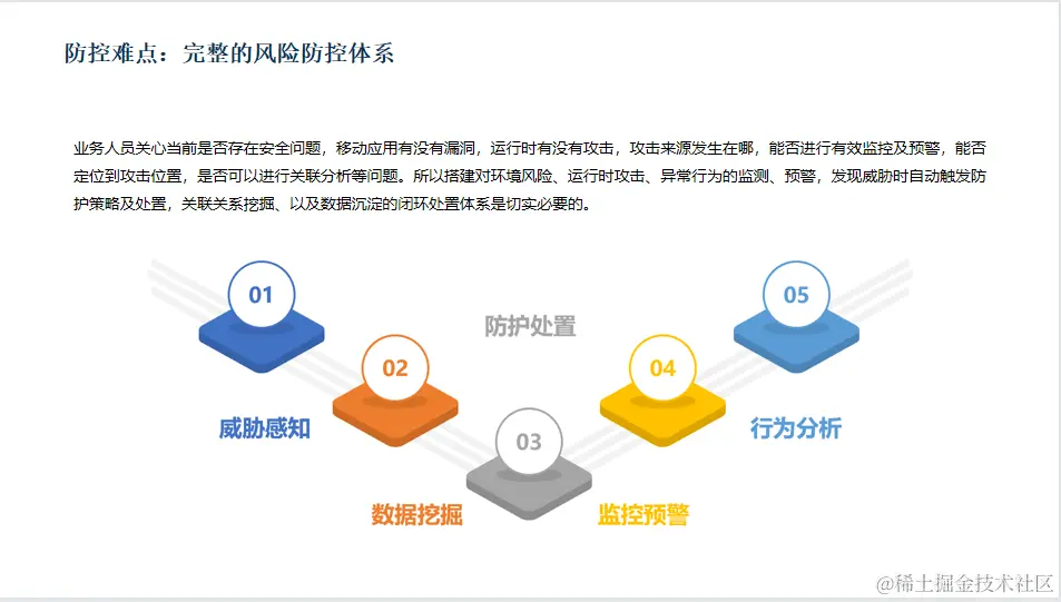 风控每个平台都会做,但是风控体系完整与否才是差别所在。对业务人员来说,他们关心的是当前是否存在安全问题,移动应用有没有漏洞,运行时有没有攻击,攻击来源发生在哪,能否进行有效监控及预警,能否定位到攻击位置,是否可以进行关联分析等问题。所以搭建对环境风险、运行时攻击、异常行为的监测、预警,发现威胁时自动触发防护策略及处置,关联关系挖掘、以及数据沉淀的闭环处置体系是切实必要的。
