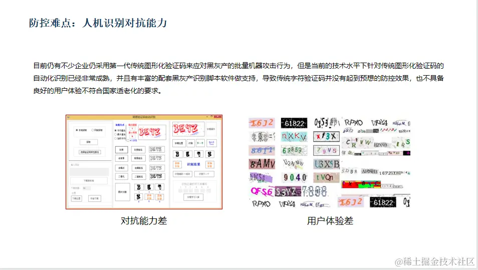 目前仍有不少企业仍采用第一代传统图形化验证码来应对黑灰产的批量机器攻击行为,但是当前的技术水平下针对传统图形化验证码的自动化识别已经非常成熟,并且有丰富的配套黑灰产识别脚本软件做支持,导致传统字符验证码并没有起到预想的防控效果,也不具备良好的用户体验不符合国家适老化的要求,这也进一步使得黑灰产有了更多发挥空间。