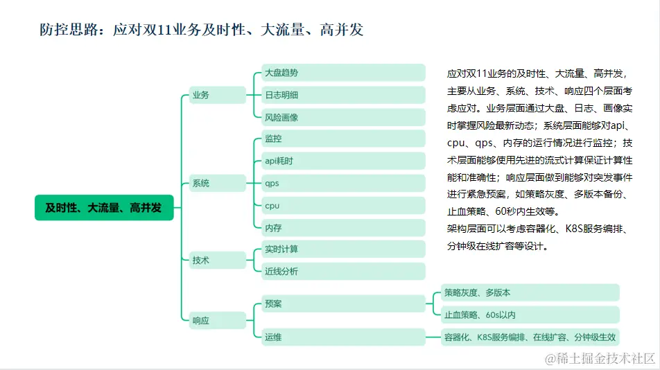 针对双十一的高流量、高并发问题,应从业务、系统、技术、响应四个层面考虑应对。业务层面通过大盘、日志、画像实时掌握风险最新动态;系统层面能够对API、CPU、GPS、内存的运行情况进行监控;技术层面能够使用先进的流式计算保证计算性能和准确性;响应层面做到能够对突发事件进行紧急预案,如策略灰度、多版本备份、止血策略、60秒内生效等。