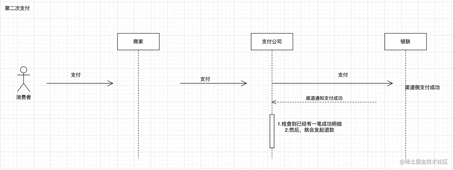 问题来了,在第二次支付的时候,渠道侧也成功了,这个时候渠道会通知支付公司,支付公司检查到已经有了一笔成功明细,支付公司就会发起退款。第二笔明细的状态也会被更新为多次支付状态,说白了,就是同一笔订单,只能有一笔成功支付明细。