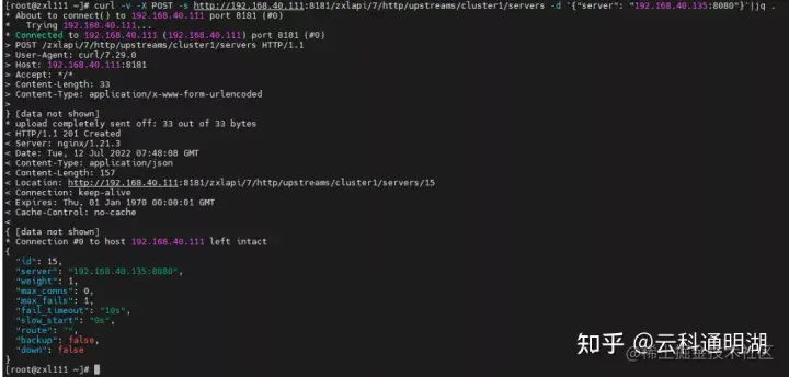 curl -v -X POST -s http://192.168.40.111:8181/zxlapi/7/http/upstreams/cluster1/servers -d '{"server": "192.168.40.135:8080"}'|jq .