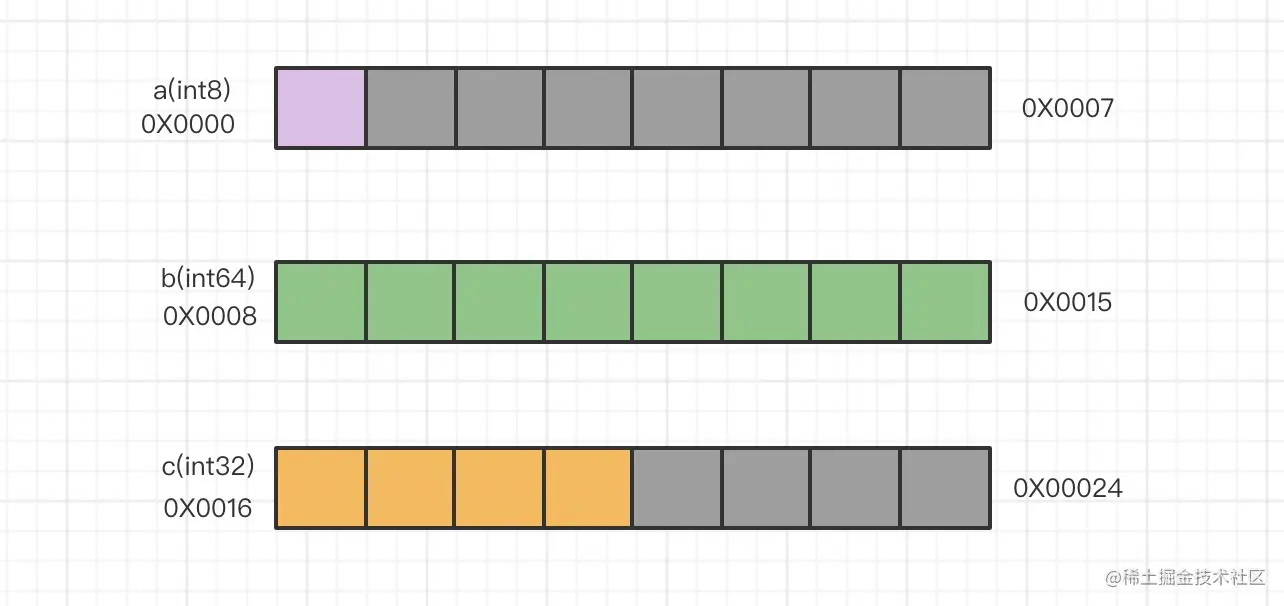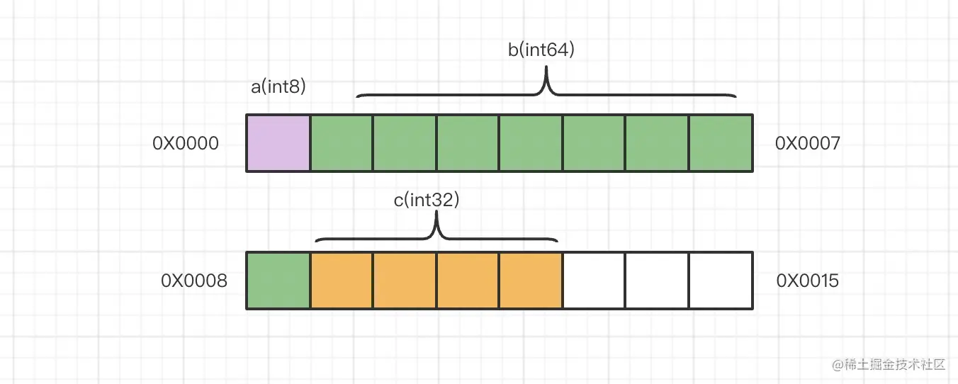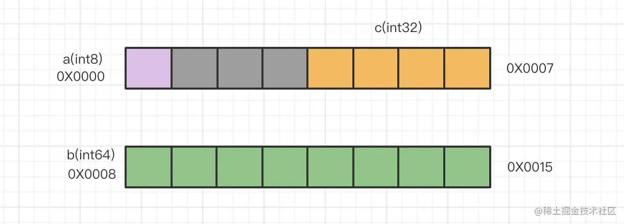 通过上面示例,我们可以看到两个结构体中3个字段类型相同,当排列顺序发生变化时,总的内存大小也会发生变化。下面我们来一起分析一下: