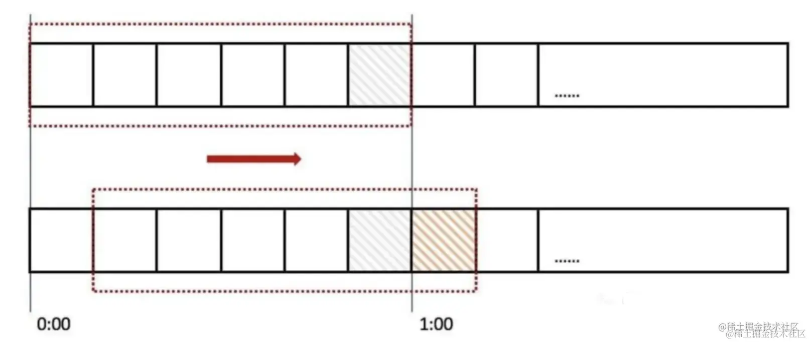 上图中我们用红色的虚线代表一个时间窗口(一分钟),每个时间窗口有 6 个格子,每个格子是 10 秒钟。每过 10 秒钟时间窗口向右移动一格,可以看红色箭头的方向。我们为每个格子都设置一个独立的计数器 Counter,假如一个请求在 0:45 访问了那么我们将第五个格子的计数器 +1(也是就是 0:40~0:50),在判断限流的时候需要把所有格子的计数加起来和设定的频次进行比较即可。
