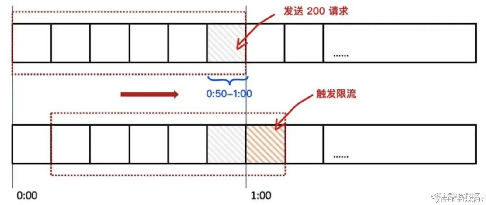 当用户在 0:59 秒钟发送了 200 个请求就会被第六个格子的计数器记录 +200,当下一秒的时候时间窗口向右移动了一个,此时计数器已经记录了该用户发送的 200 个请求,所以再发送的话就会触发限流,则拒绝新的请求。