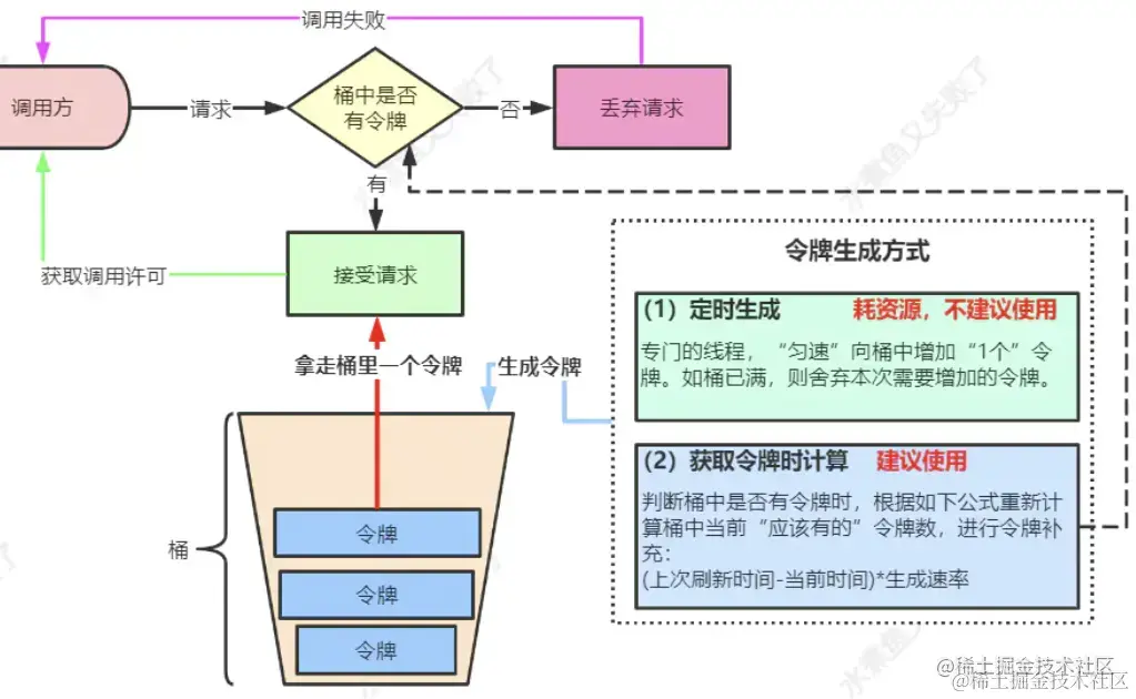 我们有一个固定的桶,桶里存放着令牌(token)。一开始桶是空的,系统按固定的时间(rate)往桶里添加令牌,直到桶里的令牌数满,多余的请求会被丢弃。当请求来的时候,从桶里移除一个令牌,如果桶是空的则拒绝请求或者阻塞。