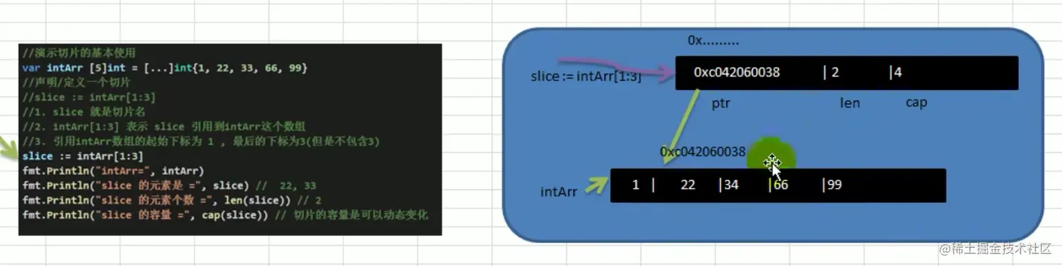 fmt.Println("slice 的容量 = ", cap(slice)) // 切片的容易是可以动态变化的