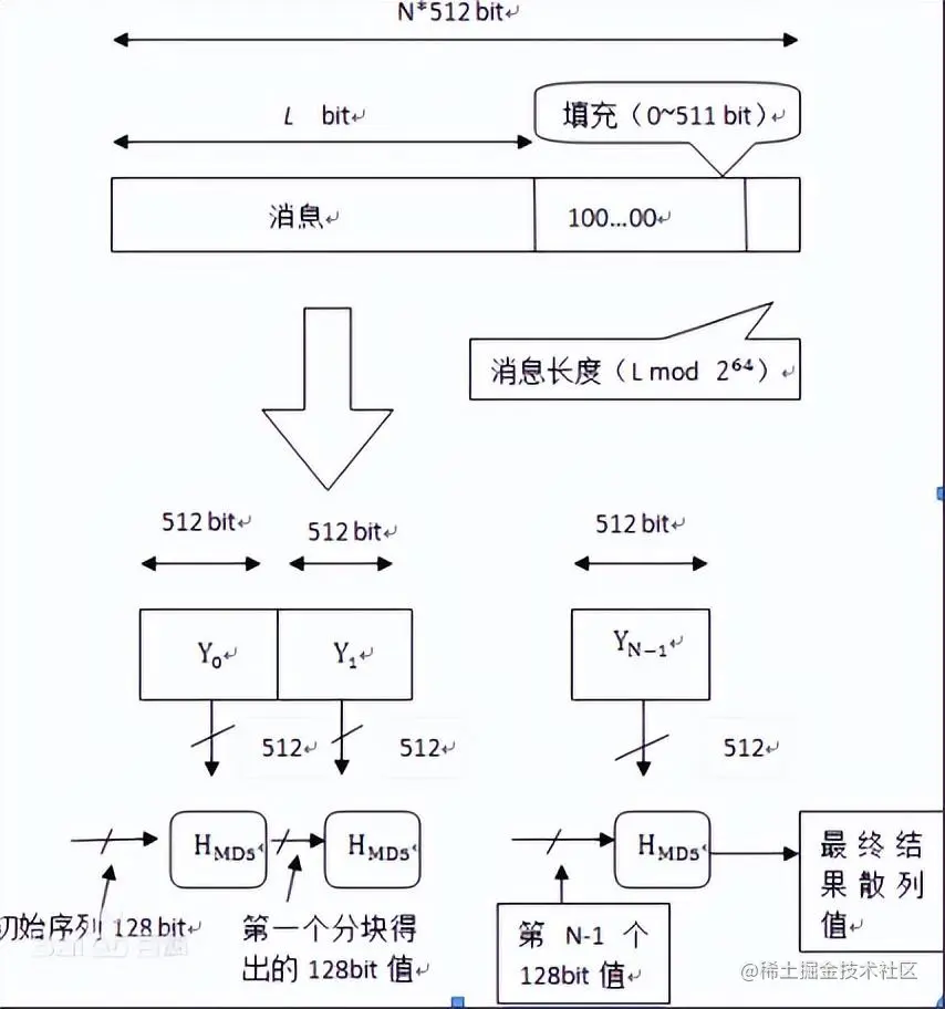 MD5码是以512位分组来处理输入的信息,且每一分组又被划分为16个32位子分组,经过了一系列的处理后,算法的输出由四个32位分组组成,将这四个32位分组级联后将生成一个128位散列值。