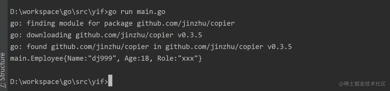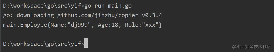 可以看到它自动下载这个库的指定版本了(go: downloading github.com/jinzhu/copier v0.3.5),并且代码运行成功。