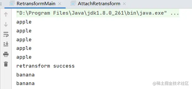 ClassFileTransformer转换器依旧复用了上面的FruitTransformer,重点看一下新加的第二个参数,当canRetransform为true时,表示允许重新定义 class。这时,相当于调用了转换器ClassFileTransformer中的transform方法,会将转换后 class 的字节作为新类定义进行加载。
