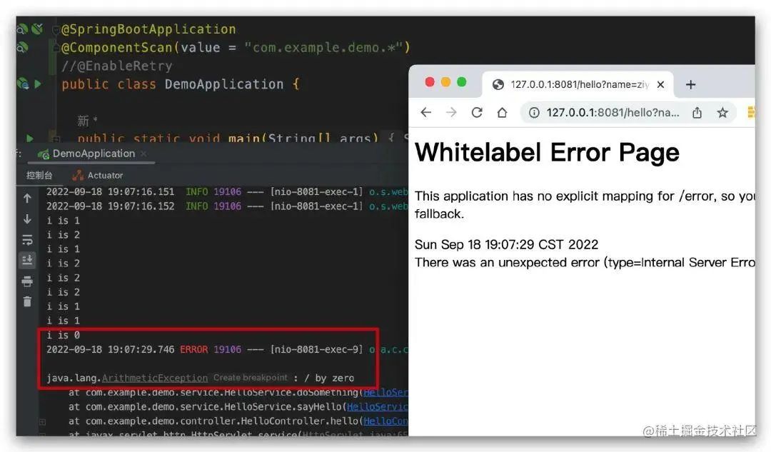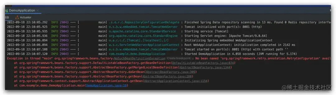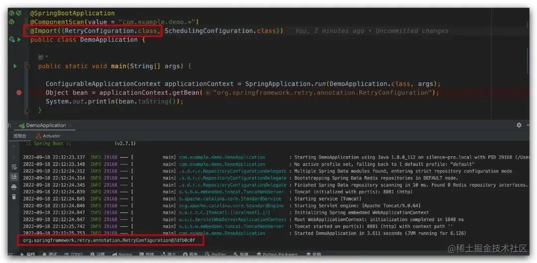 可以看到,这次我们成功的获取到了这个 Bean,这个实验就是告诉我们,其实在默认情况下,Spring 的容器中是找不到RetryConfiguration 这个 Bean 的,因此我们需要通过使用 @Import 注解,将该类加载到容器中。