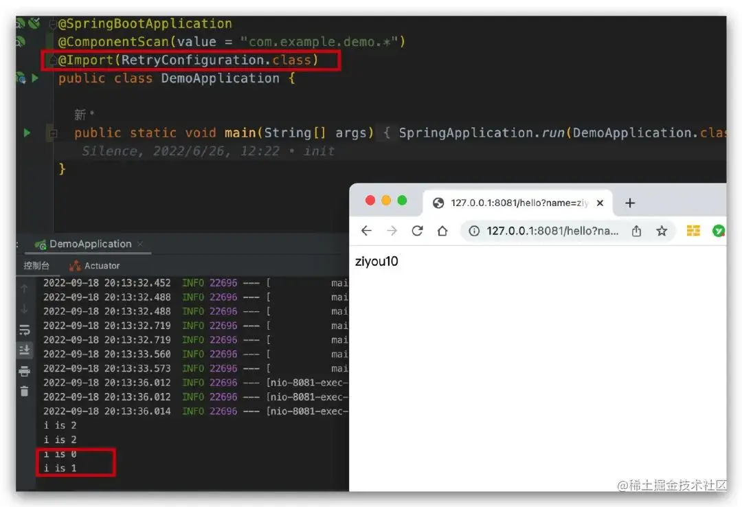可以看到源码很简单,其中最有用的就一行 @Import(RetryConfiguration.class) ,我们可以尝试把这一行代码放到启动类上面看看效果,如下所示,可以看到项目可以正常启动,并且也还是有效果的,说明跟我们的 @EnableRetry 注解是一样的。