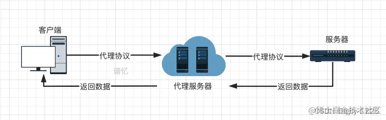 左边和右边的电脑在通讯时候,需要经过中间的电脑中转,而中间的那部电脑就是代理服务器。